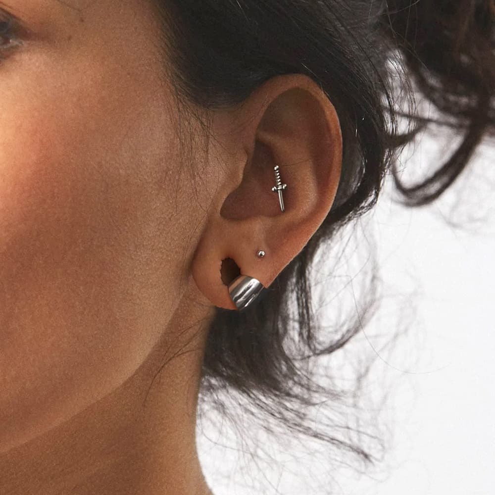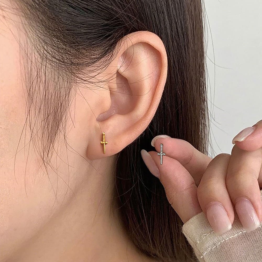 “Twolobes’ Sword Stud – a sleek, fearless touch for your everyday piercing look.”
